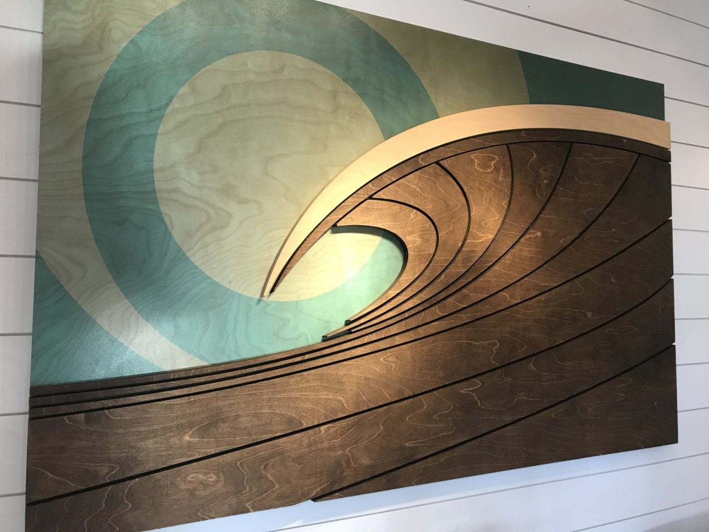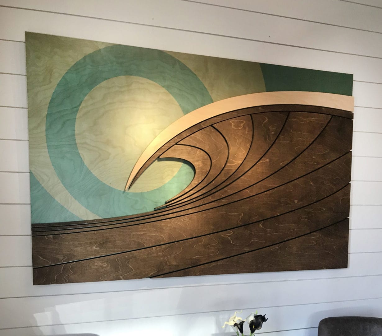3D wood art depiction of a shore break wave