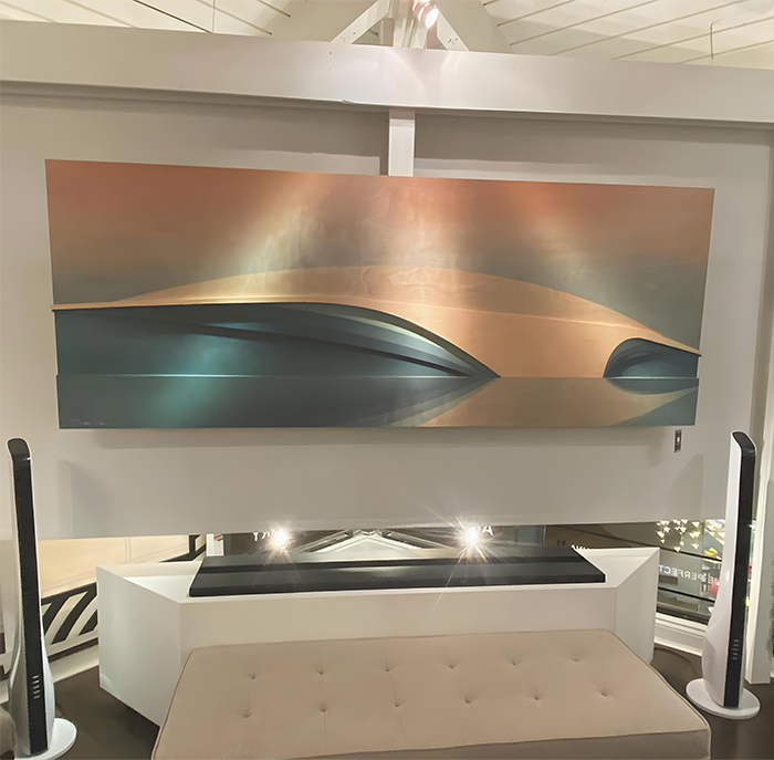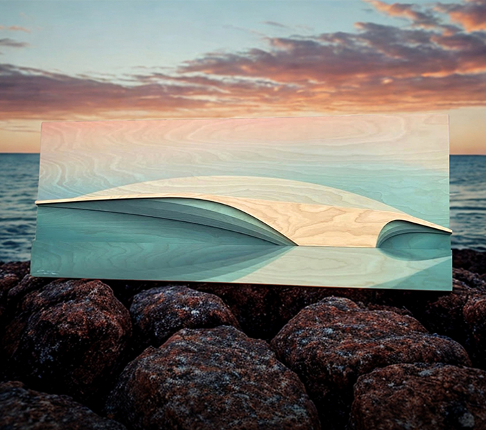 A mix of blue and green hue woodwaves with a unique wave reflection gives this modern coastal sculpture a cool ocean aesthetic.