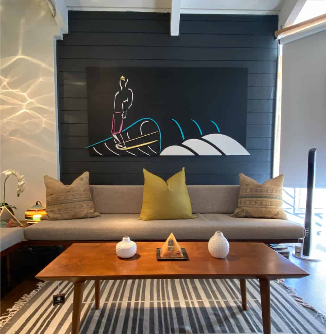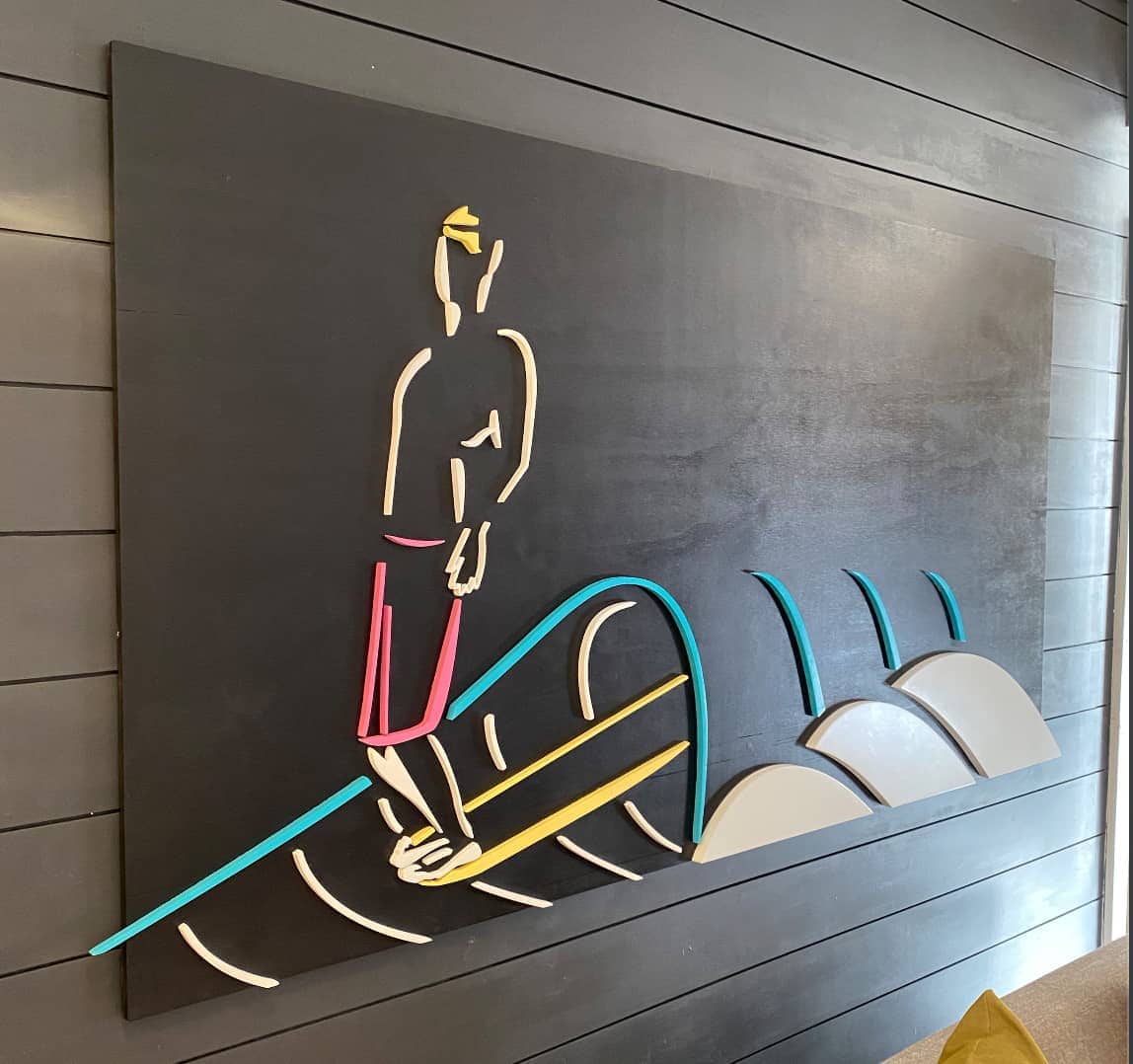 Shaun plays with the raised wood to give a 3D effect that gives a faux-realistic look to his art and quite literally makes it pop. The piece has waves overhanging from the side frame, giving it a multi-dimensional look. It’s almost as if you can see the waves movement and can follow along with your eyes – playing out the scene unfolding before you. The high contrast of its dark background and bright, colorful, and simple elements adds even more pop to this retro inspired piece. With this particular wood wall sculpture, he combines vintage surf art with organic mediums and re-introduces it to the 21st century.
