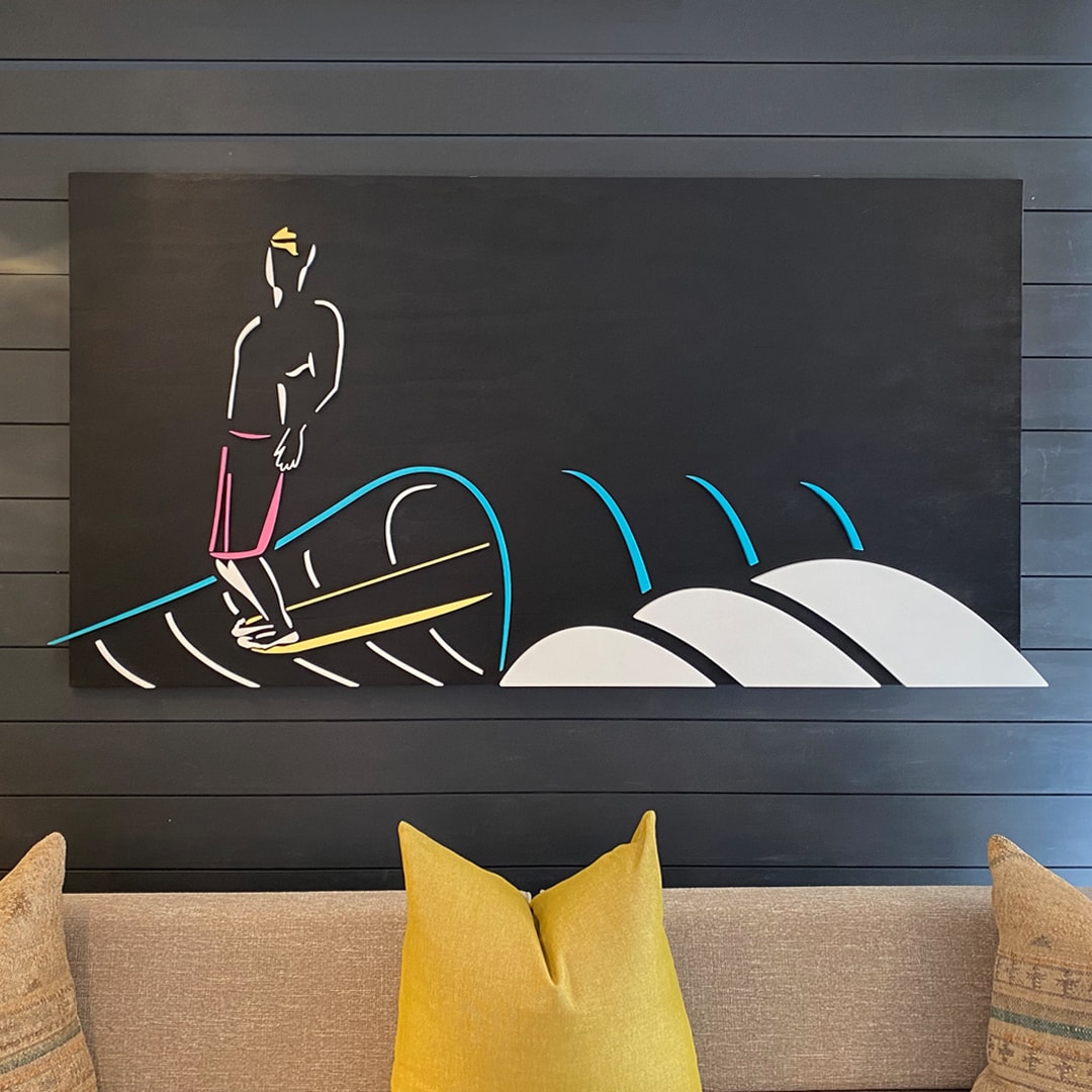 New retro wave sculpture inspired by the iconic "Endless Summer" movie, a surf documentary that transformed surf culture and birthed retro surf art. "Toes On The Nose" depicts a long-boarder hanging ten coasting through a wave. Shaun Thomas references the original "Endless Summer" poster by using bright colors like blue, pink, and orange accompanied by negative space. To ensure the colors popped, he opted out of using dyes or stains and instead decided to use spray paint. This gives the sculpture a vibrant pop of color.
