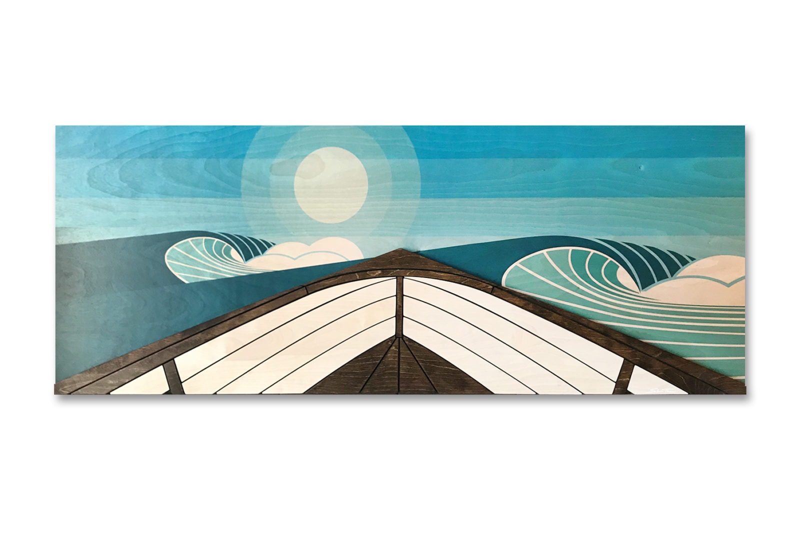 Point of view perspective on a boat, searching for that perfect wave. This wood wall sculpture includes 3/4" stained maple wood pieces mounted on a 3/4" colored background. The vibrant wood grain pattern throughout gives the piece a unique artistic element, making each art piece different than the other. All coastal sculptures are numbered, signed and dated.