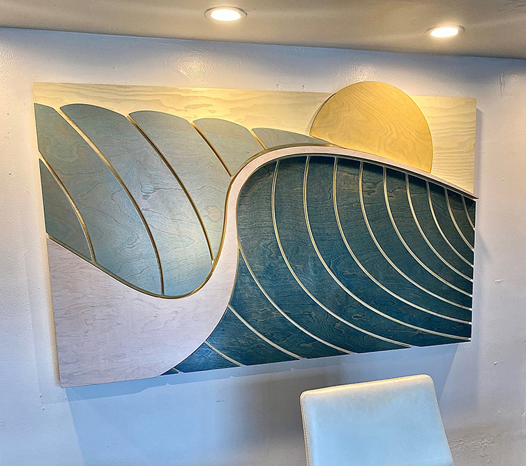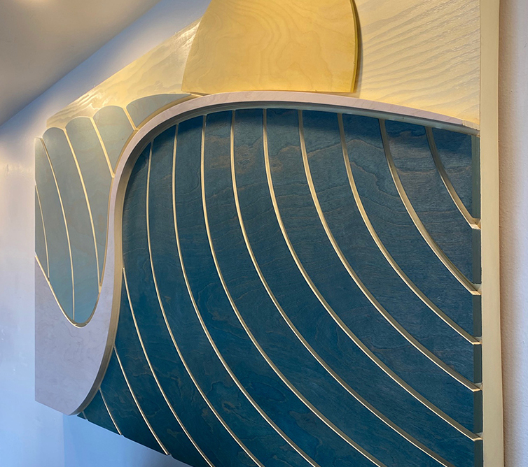 I wanted the lines on this wave to really pop so I painted the sides of each cut white which are usually dark brown. As you walk around the piece, the curves really stand out, continuously drawing your eye towards the center of the piece.
